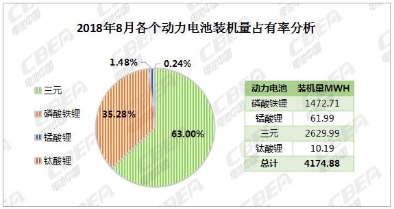 從不同電池類型來看,4.17Gwh裝機總量中,三元動力電池裝機量為2.63Gwh,占比63%;磷酸鐵鋰動力電池裝機量為1.47Gwh,占比35.28%;錳酸鋰動力電池裝機量為0.06Gwh,占比1.48%;鈦酸鋰動力電池裝機量為0.01Gwh,占比0.24%。