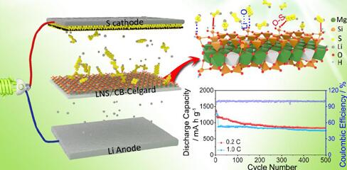 最近,中國科學(xué)院蘭州化學(xué)物理研究所研究員張俊平團隊首次報道了一種黏土礦物超親電解液鋰電池隔膜。鋰皂石含有豐富的O活性位點和Li+,還具有獨特的片層結(jié)構(gòu)和較大比表面。鋰皂石首次被應(yīng)用到鋰硫電池中,用于抑制聚硫化物穿梭,并提高隔膜的Li+電導(dǎo)率。