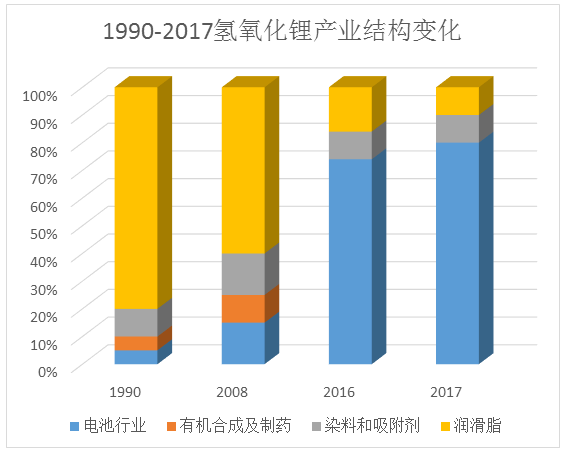 而氫氧化鋰的產(chǎn)業(yè)結(jié)構(gòu),也在逐年發(fā)生變化: