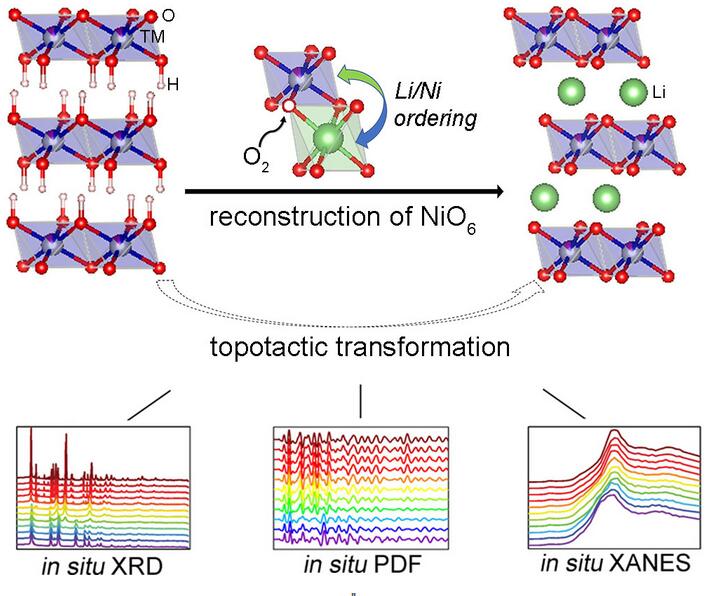 團隊通過原位同步輻射XRD揭示了長程尺度上發生的從層狀前驅體氫氧化物Ni 0.77 Co 0.13 Co 0. 10 (OH) 2 到層狀氧化物LiNi 0.77 Co 0.13 Co 0. 10 O 2 的拓撲相轉變過程,以及相伴發生的先Li/Ni無序再Li/Ni有序的局域結構變化過程;原位PDF和原位XAS相結合將局域八面體內的Li/Ni無序過程與過渡金屬Ni/Co/Mn的氧化動力學關聯起來,揭示了NiO 6 八面體的對稱性破缺和重構是Li/Ni無序現象發生的根本原因。這一原位實驗結果進一步被理論計算結果所驗證。這些發現揭示了高Ni層狀材料結構無序的合成起源,為合成過程中降低甚至消除結構無序提供了理論指導,有望顯著提升富鎳材料的實際容量及能量密度。該工作近日發表國際在化學和材料領域的知名雜志在‘美國化學會志(Journal of American Chemical Society,DOI:10.1021/jacs.8b06150,影響因子為14.357)上。
