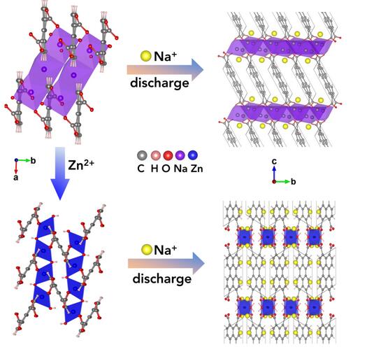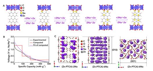 鈉離子在Zn-PTCA中的嵌入位點(A)、嵌入電壓(B)以及遷移通道(C)