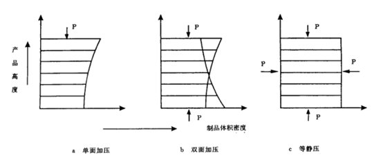 為制造細結構 ,質地致密 ,組織均勻的炭石墨材料 ,采用粉末壓制 (而非糊料 )是唯一的方法。而用粉末壓制只有采用模壓方法和等靜壓方法。在采用模壓成型時 ,無論是單面壓制或雙面壓制 ,受摩擦力 (炭質顆粒間和制品與模具間 )的影響 ,壓力的傳遞將逐漸降低 ,從而造成體積密度的不均勻。這種差異 ,隨制品的高度增加而加大。具體情況如圖2所示。