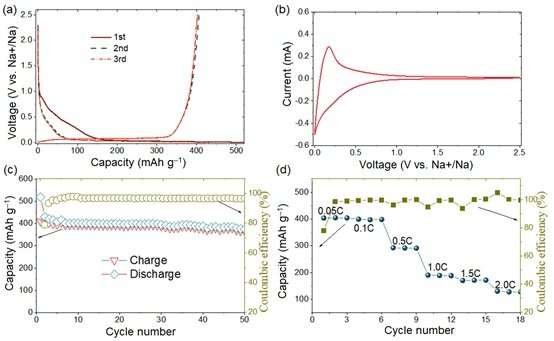 盡管人們已投入大量精力開發(fā)高性能的碳陽極材料,但在放電-充電曲線中的一致性通常呈現(xiàn)為兩個不同的區(qū)域:在~0.1 V以上的斜坡區(qū)域和~0.1V以下的平坦區(qū)域。通常,平坦區(qū)比斜坡區(qū)具有更高的容量,高容量碳陽極往往顯示出相當大比例的平坦區(qū)能力,這在一定程度上可以進一步提高全電池的能量密度。因此,設計和發(fā)現(xiàn)具有大比例平坦容量的碳陽極可能是提高NIBs能量密度的潛在途徑。