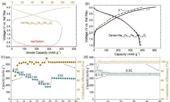 (a) 碳陽極和Na0.9Cu0.22Fe0.30Mn0.48O2陰極充放電電壓分布示意圖。碳陽極//Na0.9Cu0.22Fe0.30Mn0.48O2全電池的電化學性能。(b) 充放電曲線。(c)倍率性能。(d) 循環(huán)性能。圖片來源:中國科學出版社