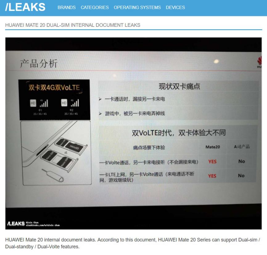除了石墨烯散熱技術之外,最近還有知名爆料網站slashleaks爆料了一張華為Mate20系列發布會的PPT,說明這款將于10月16日發布的新機將采用雙卡雙通技術,這個技術可以說是實力打臉了新iPhone的DSDS。