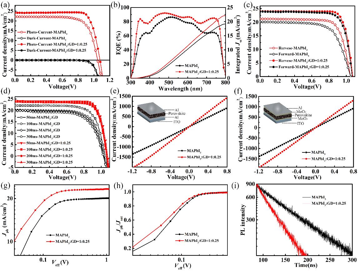 隨后,研究人員從瞬態熒光、激子產生率、導電性等方面探究了器件性能提升的原因,結果表明石墨炔的引入不僅有效減少了晶界,抑制了電荷在晶界處的復合,同時有效提高了電荷的傳輸,這些效果均有利于器件填充因子和短路電流密度的提高,進而提高了器件性能。同時由于鈣鈦礦薄膜質量的提高、缺陷態密度的減少,使得器件的遲滯效應和穩定性也得到極大改善。