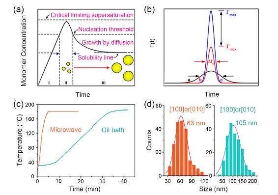 圖1 經典的LaMer形核和生長機制以及實驗結果。(a)經典LaMer機理,顆粒在溶液中成核和生長過程中單體濃度變化的示意圖。(b)三個具有高斯分布的形核函數。形核函數的寬度()對應形核時間窗口。(c)微波加熱和油浴加熱兩種加熱模式下的原位溫度與時間曲線。(d)由兩種不同的加熱模式制備的LiFePO4沿[100]或[010]方向的尺寸統計。微波加熱的尺寸為63nm,而在常規油浴加熱的情況下,尺寸為105nm。