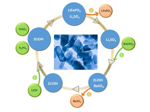 圖2 LiFePO4納米晶水熱合成路線及鋰回收示意圖。以LiOH、FeSO4和H3PO4為原料制備納米LiFePO4。用Ba(OH)2做沉淀劑與濾液反應,隨后進行固液分離,回收LiOH。插圖為LiFePO4的TEM照片。