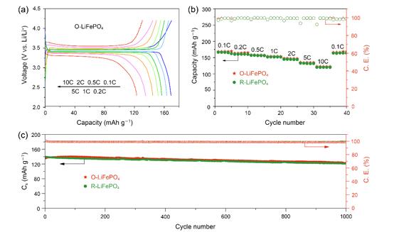 圖4 原始的O-LiFePO4/C和回收的R-LiFePO4/C的電化學性能曲線。(a)O-LiFePO4/C在0.1–10C不同倍率范圍內的典型充放電曲線。(b)倍率性能。(c)O-LiFePO4/C和R-LiFePO4/C在3C倍率下的長循環穩定性。3C對應的充電或放電時間為20分鐘。