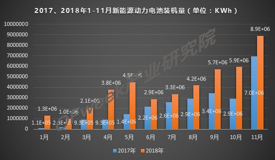 中國粉體網訊 新能源汽車強勁的增長勢頭帶動動力電池產業的持續高漲,OFweek產業研究院分析數據顯示,2018年11月,我國新能源汽車動力電池裝機量約8.91GWh,環比增長50.16%,同比增長28.14%,2018年1-11月累計裝機量約為43.59Wh。