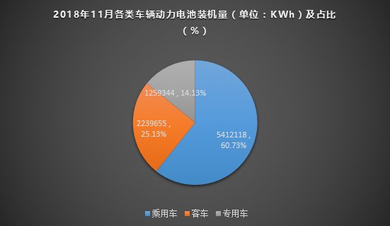 從車輛細分類別來看,2018年11月,我國新能源乘用車動力電池裝機量約為5.41GWh,占比60.73%,新能源客車動力電池裝機量約為2.24GWh,占比25.13%,新能源專用車動力電池裝機量約為1.26GWh,占比14.13%。