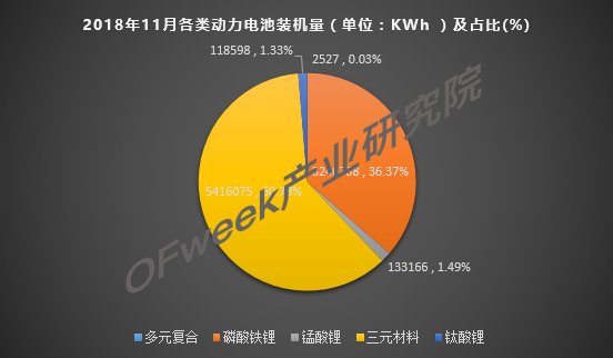 從不同類型動力電池來看,三元材料動力電池裝機量約為5.42GWh,占比60.78%,磷酸鐵鋰動力電池裝機量約為3.24GWh,占比36.37%。