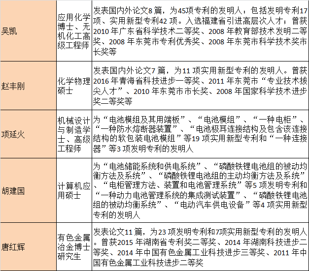 寧德時代的核心技術主要來源于以吳凱、趙豐剛、項延火、胡建國、唐紅輝等為核心的技術研發團隊以自主研發的方式進行的技術積累。這5名核心技術人員所取得的專業資質、重要科研成果和獲獎情況如下: