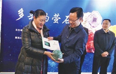 中國粉體網訊 昨日,中國地質博物館聯合中國武義螢石博物館、浙江武義春雷工藝品公司在中國地質博物館舉辦螢石珠寶展,向人們展出精美的螢石珠寶,展期為4個月。圖為開幕當天,中國武義螢石博物館、浙江武義春雷工藝品公司總經理周翠芳向中國地質博物館副館長李元恒捐贈螢石夜明珠和七彩螢石珠寶,作為中國地質博物館永久收藏。