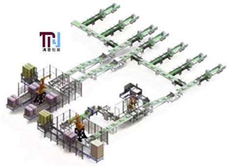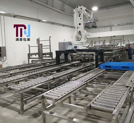 全自動機器人碼垛一般包括:倒袋整形輸送機、重量復檢秤、不合格剔除機、爬坡輸送機、棍子整袋輸送機、緩停皮帶輸送機、取袋輸送機、自動托盤庫、空托盤輸送機、碼垛輸送機、存垛輸送機、出垛輸送機、機械手碼垛機(品牌選配)、輸送線控制柜。