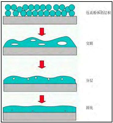 無(wú)需溶劑系統(tǒng)的干法包衣技術(shù)正受到越來(lái)越多的重視,其主要可分為液體輔助包衣法和熱熔包衣法。干法粉末包衣的整個(gè)過(guò)程需要經(jīng)歷包衣材料的層積、交聯(lián)、分層及固化。