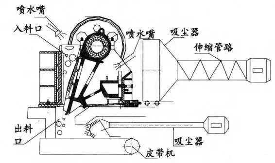 在出料口和破碎腔動顎后檢修口處分別安裝一臺吸塵器,通過吸塵手段控制粉塵的擴散。其中:出料口吸塵器的吸塵罩距離出料口約1000mm左右,吸塵罩平面與粉塵流動方向垂直;動顎后吸塵器吸塵罩與風機之間的連接風管設計成可伸縮性管道,以方便給破碎機動顎加油及日常維修。