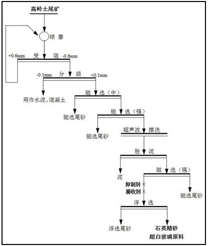 本發明涉及一種超白玻璃用原料的制備方法,其特征在于包括以下步驟:a.高嶺土尾礦經球磨、篩分、分級,脫除泥質膠結物,b.隨后經多段磁選工藝,去除含鐵雜質礦物;c.磁選后精砂經超聲波擦洗、脫泥;d.脫泥后精砂用強磁選處理,去除脫落的鐵泥;e.強磁選后精砂經中性正浮選,使石英砂與氧化鐵浸染型石英砂、含鐵鋁硅酸鹽礦物有效分離。本發明的有益效果:1.提高了高嶺土尾礦綜合利用價值,使石英砂產品附加值增加;2.制得一種超白玻璃用原料且工藝流程簡單,能耗低;3.中性浮選藥劑廢水,易處理達標排放。