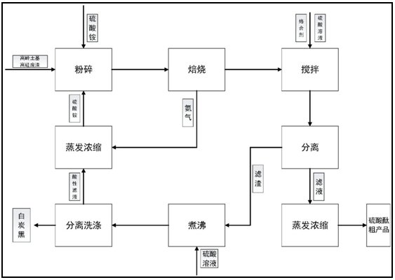 本發明涉及一種由高嶺土基高硅廢渣生產白炭黑的制備方法,包括以下步驟的方法:首先將高硅廢渣與助劑按一定比例混合研磨至過200目,以一定的溫度在馬弗爐中煅燒,冷卻至室溫;向煅燒后的粉料中加入一定量硫酸溶液和少量絡合劑,混合攪拌一段時間后過濾,濾液蒸發濃縮后得到硫酸鈦粗產品;將濾渣與一定量硫酸溶液混合煮沸一定時間后過濾,洗滌至中性,烘干即得白炭黑產品。本發明利用高嶺土基高硅廢渣作為硅源,實現變廢為寶,更具有經濟意義和環保價值,而且工藝簡單,固定資產投資少、原料來源廣、生產成本低、無三廢排放。