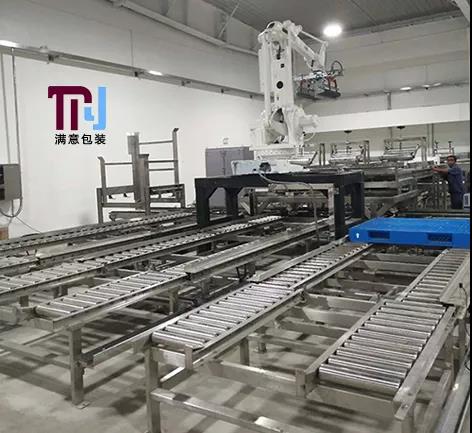 全自動機器人碼垛一般包括:倒袋整形輸送機、重量復檢秤、不合格剔除機、爬坡輸送機、棍子整袋輸送機、緩停皮帶輸送機、取袋輸送機、自動托盤庫、空托盤輸送機、碼垛輸送機、存垛輸送機、出垛輸送機、機械手碼垛機(品牌選配)、輸送線控制柜。