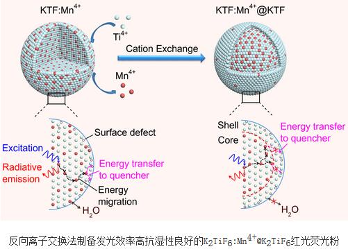 中國粉體網(wǎng)訊 白光LED由于其節(jié)能、環(huán)保以及長壽命等優(yōu)點被廣泛應用于照明和液晶顯示領域。特別的,就液晶顯示背光源而言,其要求發(fā)光材料(藍、綠、紅)具有盡可能窄的發(fā)射帶寬和合適的發(fā)射波長,從而獲得高的色純度及廣的色域范圍(>92% NTSC),而目前商用的氮化物紅色熒光粉難以滿足這一要求。近些年,Mn4+離子摻雜的氟化物熒光粉由于其能被藍光有效激發(fā)、高發(fā)光效率以及~630nm的尖銳譜線發(fā)射(帶寬<7nm)等優(yōu)勢而受到廣泛關注,在廣色域液晶顯示領域具有很好的應用前景。但是,該類材料的抗?jié)裥阅芷毡檩^差,這主要是因為材料表面的Mn4+離子易與空氣中的水分發(fā)生水解反應,導致材料劣化,影響最終LED器件的壽命,這也成為阻礙其商業(yè)化應用的最大挑戰(zhàn)。