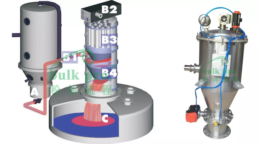 ★ 物料達到料倉設定限位時,真空泵自動關閉,輸送設備內的壓力達到常壓平衡狀態。放料閥B4開啟,物料通過出料口流出,并直接落入儲料容器C;