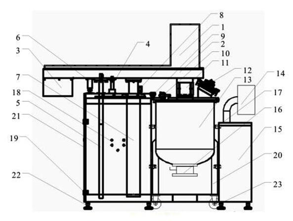 1-攪拌電機;2-減速器;3-外罩;4-導(dǎo)向桿;5-定位桿;6-防撞盤;7-液壓缸;8-接近開關(guān);9-導(dǎo)向輪;10-視鏡孔;11-攪拌槳;12-投料孔;13-混合桶體;14-觸摸屏及外罩;15-機柜;16-出料閥;17-接近開關(guān);18-接近開關(guān);19-設(shè)備骨架;20-筒體支腳;21-設(shè)備骨架;22-設(shè)備支腳;23-筒體腳輪