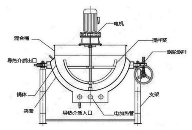 夾層鍋由鍋體和支腳組成。鍋體是由內(nèi)外球形鍋體組成的雙層結(jié)構(gòu)形式,通過電機帶動攪拌槳對物料進行攪拌混合,混合主要以對流混合為主。此外,中間夾層通入加熱介質(zhì)(蒸汽、導(dǎo)熱油、熱水等)加熱。有固定式、可傾式等樣式。傾倒式夾層鍋通過手柄帶動鍋輪鍋桿轉(zhuǎn)動鍋體,從而實現(xiàn)倒料操作。