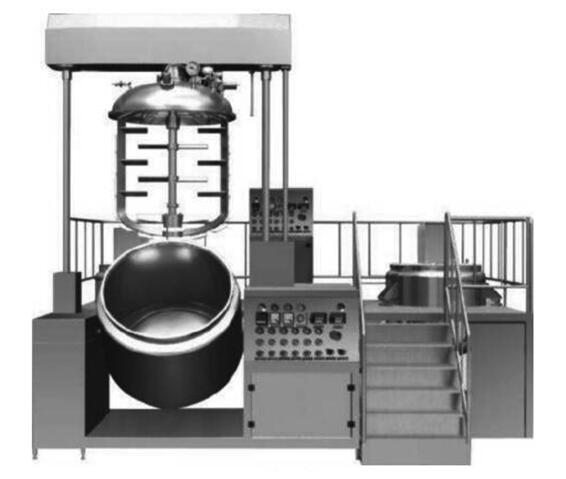 真空制膏機由真空系統(tǒng)、加熱系統(tǒng)、升降系統(tǒng)、攪拌槳和混合罐體、控制系統(tǒng)等構(gòu)成。物料加入罐體內(nèi),開啟攪拌槳、剪切刀進行混合,混合過程既有對流混合,也有剪切混合,此外,還可以按照需要進行抽真空、加熱等操作,攪拌槳的升降使用液壓缸進行升降,攪拌混合完成后,物料通過傾倒出料,或通過海底閥進行出料操作。