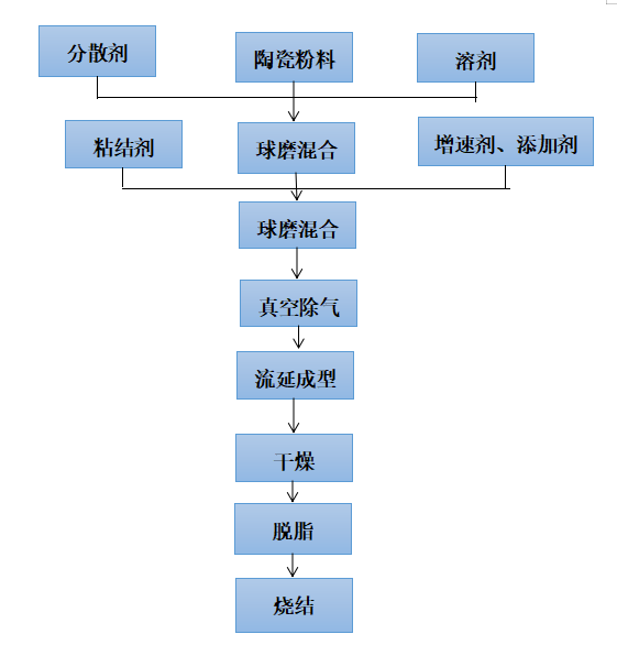 流延成型工藝包括漿料制備、流延成型、干燥、脫脂、燒結等工序,其中最關鍵的是漿料的制備和流延工藝的控制。