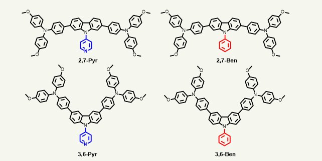 雖然大量無機及聚合物空穴傳輸材料已被應用到鈣鈦礦太陽電池,但是由于小分子材料具有聚合物可以溶液加工,結構多樣化等優點,又因為結構確定,避免了批次差異,重復性好,因此研究最為廣泛,基于此類材料的器件展現出較好的性能。其中小分子spiro-OMeTAD是鈣鈦礦太陽電池中最為高效的空穴傳輸材料,但是其價格昂貴、水氧穩定性差等缺點限制了該分子的應用。另一方面,眾多研究也表明spiro-OMeTAD不能有效鈍化鈣鈦礦薄膜表面缺陷態,限制了鈣鈦礦太陽電池器件效率和穩定性的進一步提升。