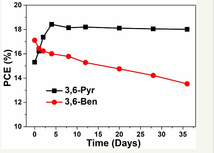 針對上述問題,華北電力大學劉雪朋等將具有鈍化鈣鈦礦薄膜表面缺陷態功能的吡啶單元引入到咔唑-三苯胺類小分子中,開發了一系列廉價的新型小分子空穴傳輸材料。利用吡啶基團與鈣鈦礦材料之間的相互作用,改善界面接觸,使HTM同時具備鈍化鈣鈦礦薄膜表面缺陷態和傳輸空穴的雙重作用,在避免鈣鈦礦缺陷態鈍化材料使用的情況下,減少該界面處(鈣鈦礦/HTM)缺陷態密度,最終得到了光電轉換效率達到18.45%鈣鈦礦太陽電池器件。另外,由于吡啶單元可以有效鈍化鈣鈦礦薄膜表面的缺陷態,器件穩定性顯著提升。