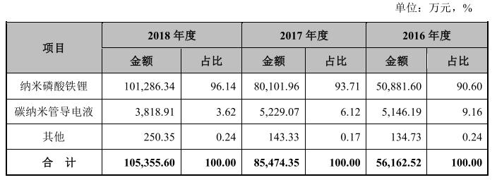 招股說明書顯示,德方納米主營業(yè)務(wù)收入按照產(chǎn)品類別劃分,2018年的構(gòu)成為納米磷酸鐵鋰收入10.13億元,占比96.14%;碳納米管導(dǎo)電液收入3818.91萬元,占比3.62%;其他收入250.35萬元,占比0.24%。詳情如下: