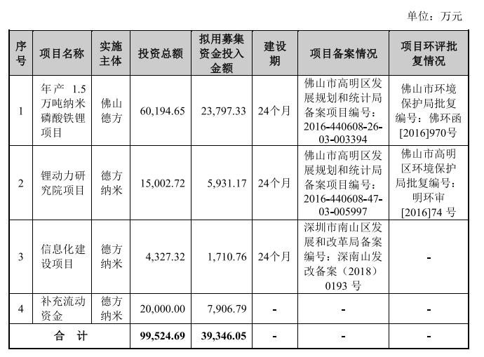 德方納米招股說明書顯示,公司本次發(fā)行募集資金總額扣除發(fā)行費(fèi)用后的募集資金凈額將全部用于公司主營業(yè)務(wù)相關(guān)的項(xiàng)目,由董事會(huì)按照項(xiàng)目的輕重緩急程度用于以下具體項(xiàng)目: