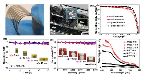 圖(a)為柔性電池照片;圖(b)為器件斷面TEM照片;圖(c)為電池性能J-V曲線;圖(d)為器件彎曲耐久性測試結果;圖(e)為器件疲勞測試結果;圖(f)為濕熱測試結(85 °C,85% RH)。