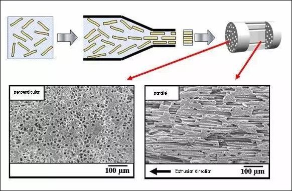 將粉料、粘接劑、潤滑劑等與水均勻混合充分混練,然后利用液壓機推動活塞,將已塑化的坯料從擠壓嘴擠出。由于擠壓嘴的內型逐漸縮小,活塞對泥團產生很大的擠壓力,使坯料致密并成型。