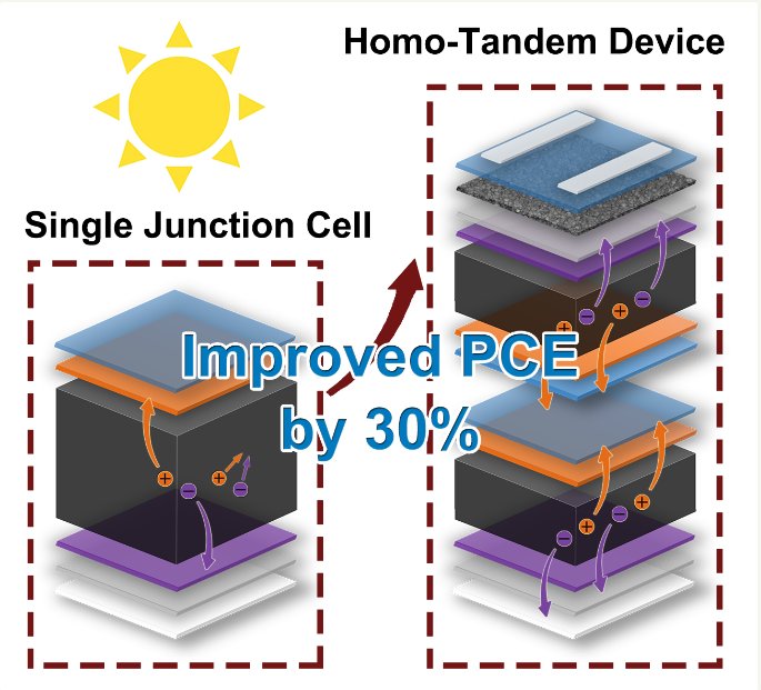 針對這一問題,北京大學(xué)工學(xué)院周歡萍團隊和合作者構(gòu)建了一種四電極的同質(zhì)準(zhǔn)二維層狀鈣鈦礦疊層太陽能電池結(jié)構(gòu),將較厚的準(zhǔn)二維層狀鈣鈦礦吸光層分為兩個較薄的準(zhǔn)二維層狀鈣鈦礦吸光層,并構(gòu)筑電池進行有效的連接。在保證了充足的太陽光吸收的基礎(chǔ)上,同質(zhì)準(zhǔn)二維層狀鈣鈦礦疊層太陽能電池可以實現(xiàn)更加有效的載流子分離和傳輸,相比較于同樣的單節(jié)器件,極大的減少了載流子復(fù)合的損失;贐A2MA3Pb4I13(n=4)準(zhǔn)二維層狀鈣鈦礦體系,反式單節(jié)器件實現(xiàn)了11.02%的光電轉(zhuǎn)化效率和10.94%的穩(wěn)態(tài)效率,而同質(zhì)疊層太陽能電池的光電轉(zhuǎn)化效率高達14.42%,穩(wěn)態(tài)效率高達13.57%。相比較于單節(jié)器件,同質(zhì)準(zhǔn)二維層狀鈣鈦礦疊層太陽能電池實現(xiàn)了光電轉(zhuǎn)化效率30%的提升。該疊層設(shè)計的構(gòu)筑可進一步拓展到其它組分的準(zhǔn)二維層狀鈣鈦礦材料。團隊還進一步研究和證實了同質(zhì)準(zhǔn)二維層狀鈣鈦礦疊層太陽能電池有著和單節(jié)器件同樣優(yōu)異的穩(wěn)定性。