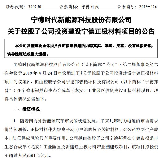 寧德時代表示未來幾年動力電池的市場需求將持續增長,正極材料作為鋰離子動力電池的核心關鍵材料,對公司控制生產成本,防范供應風險具有重要作用。故擬投資不超過人民幣91.3億元由控股子公司寧德邦普循環科技有限公司(以下簡稱“寧德邦普”)在寧德市福鼎市生態合成革(龍安)工業園區投資建設正極材料產業園建設項目。項目為年產10萬噸鋰離子電池三元正極材料鎳鈷錳酸鋰(含正極材料三元前驅體10萬噸)。項目用地面積約750畝,分兩期建設,總體建設期為五年。