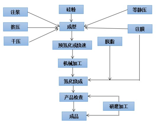 以高純、超細、高α相含量的氮化硅粉末與少量助燒劑混合,通過成形、燒結等工序制備而成。