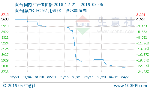 中國粉體網訊 5月5日螢石商品指數為99.47,與昨日持平,較周期內最高點127.49點(2019-01-03)下降了21.98%,較2016年12月18日最低點49.21點上漲了102.13%。(注:周期指2011-09-01至今)
