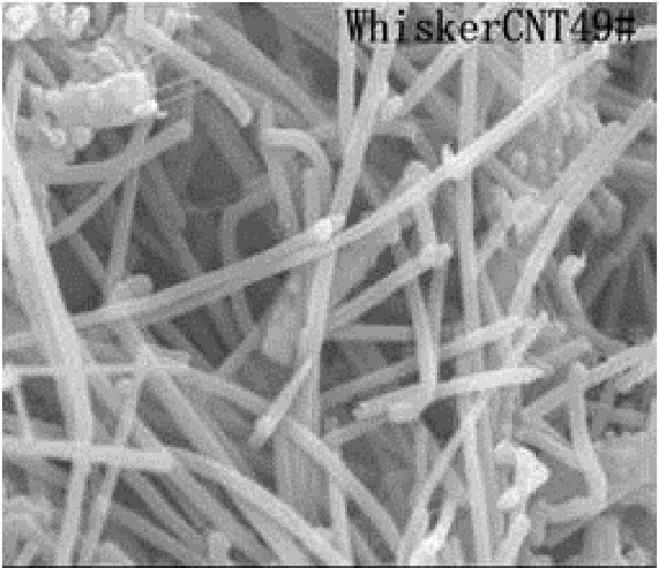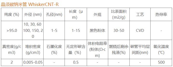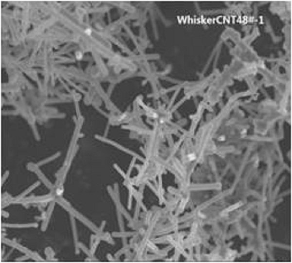 碳納米管是具有優異的機械、物理和化學性能,但傳統碳納米管團聚嚴重,缺陷多,不易分散。晶須碳納米管具有直線型碳納米管,具有極高純度和結晶度,易分散,可廣泛用于鋰離子電池、電熱轉換器件和納米復合材料領域。其高強度、高導電、高導熱,是納米復合材料的重要增強相,可大幅提升鋰離子電池的倍率性和循環性能以及復合材料的各性能。晶須碳納米管還具有極高的電解液吸附能力,是動力鋰離子電池正負極材料的重要添加劑。