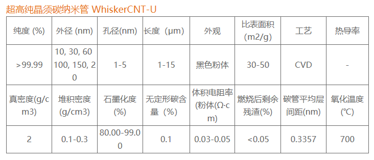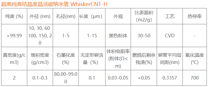 晶須碳納米管具有直線型結構、不纏繞、易分散、超高純度、超高結晶度、導電、導熱性能優異,WhiskerCNT是新一代高端碳納米管,在鋰離子電池、電熱轉換器件和納米復合材料等眾多領域具有廣泛的用途。公司目前主要產品包括各種規格的晶須碳納米管粉體、晶須碳納米管導電漿料等碳基納米材料。