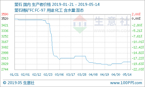 中國粉體網訊 5月13日螢石商品指數為100.44,與昨日持平,較周期內最高點127.49點(2019-01-03)下降了21.22%,較2016年12月18日最低點49.21點上漲了104.10%。(注:周期指2011-09-01至今)