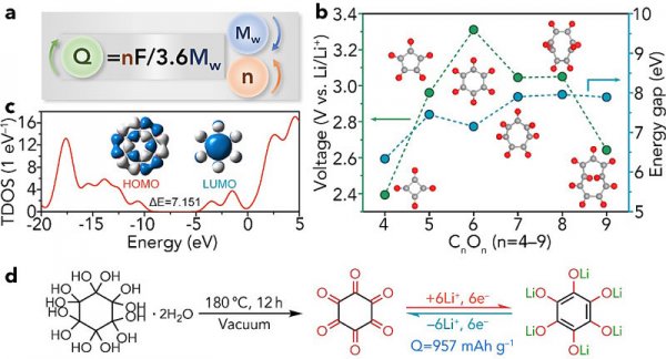 近期,南開大學(xué)的陳軍院士團(tuán)隊設(shè)計合成并研究了一種具有超高容量的鋰離子電池正極材料—環(huán)己六酮。通過分子設(shè)計可知(圖1a-c),在眾多有機(jī)羰基正極材料中,只由羰基構(gòu)成的環(huán)酮材料由于不存在任何非電化學(xué)活性的結(jié)構(gòu)單元,因而體現(xiàn)目前的最高理論比容量(957 mAh g-1)。