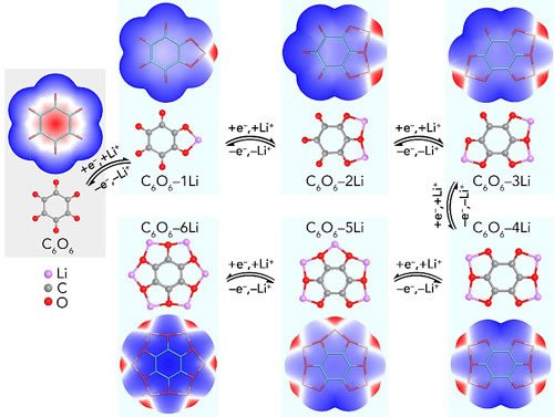 首先,研究人員通過脫水反應(yīng)合成了環(huán)己六酮(圖1d)。通過紅外和拉曼等表征手段研究了環(huán)己六酮的反應(yīng)機(jī)理,結(jié)果表明在充放電過程中發(fā)生了羰基和烯醇基團(tuán)的相互轉(zhuǎn)化。而且進(jìn)一步利用密度泛函理論計算了環(huán)己六酮脫嵌鋰的反應(yīng)過程(圖2)。接著研究了環(huán)己六酮在鋰離子電池中的電化學(xué)性能,結(jié)果表明環(huán)己六酮的放電比容量可達(dá)902 mA h g-1,平均放電平臺在1.7 V左右。此外,由于環(huán)己六酮在高極性的離子液體中的溶解度較低,使得其在離子液體基的電解液中具有較好的循環(huán)性能。該工作為高容量有機(jī)電極材料的設(shè)計、制備以及電池應(yīng)用提供了一種新的思路。