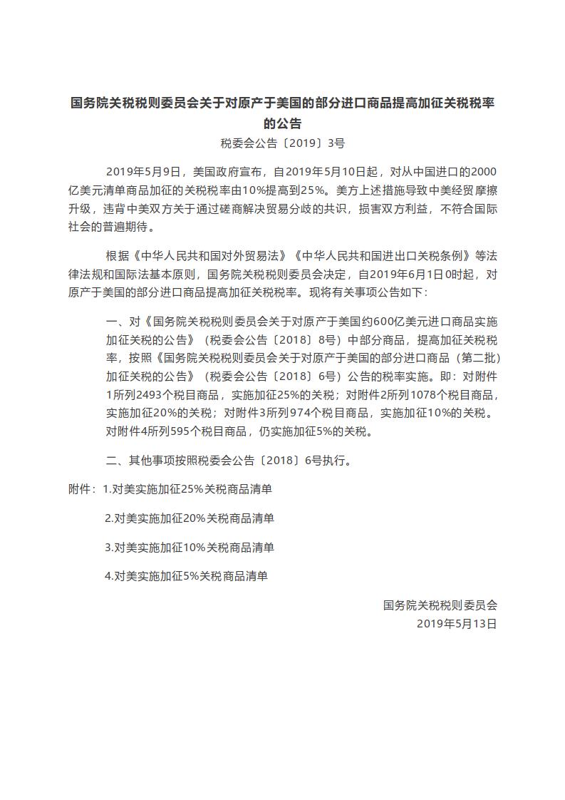 近期美方再次重啟了對(duì)我國(guó)2000億美元商品的加稅,甚至威脅會(huì)繼續(xù)推出3000億美元商品的加稅。中國(guó)是禮儀之邦,凡事講究道義二字,美方無(wú)道在前,中方幾次三番敦促其回歸正途無(wú)果。古語(yǔ)常言,來(lái)而不往非禮也。面對(duì)美方的威脅,中國(guó)決定給予堅(jiān)定果決的回應(yīng)。2019年5月13日,財(cái)政部官網(wǎng)公布了國(guó)務(wù)院關(guān)稅稅則委員會(huì)關(guān)于原產(chǎn)美國(guó)的部分商品加稅公告。