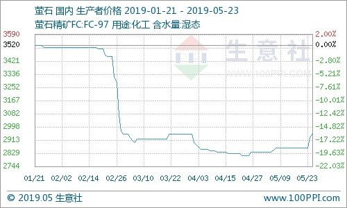 中國粉體網訊 5月23日螢石商品指數為103.73,較昨日上升了0.88點,較周期內最高點127.49點(2019-01-03)下降了18.64%,較2016年12月18日最低點49.21點上漲了110.79%。(注:周期指2011-09-01至今)