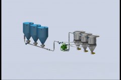 壓送式系統,采用空壓機組作為動力源,物料自某一設備出料,通過雙蝶閥,在重力作用下被加入其下方的發送罐內,置換的空氣通過排氣閥釋放出去,從而使進料更加容易,同時也消除了阻礙物料流動的反向壓力。當發送罐被裝滿時(通過料位計或稱重設備顯示,達到罐容積的90%),進料閥門和排氣閥門同時被關閉并密封,而后通過進氣閥向發送罐頂部加入壓縮空氣,加入的壓縮空氣與物料相混合,當罐內的壓力達到一定值時便自動開始推動物料移動,同時向整個輸送管道施壓,直至物料排空;中途輸送過程中伴有增壓器的補壓作用,使得輸送均勻流暢。當發送罐內壓力降為零時,氣力供給被關閉,同時少量剩余的氣體也被排出發送罐和輸送管線。物料到達終端可以直接進入預先所選擇的料倉,輸送末端產生的氣體與粉塵通過安裝于料倉上方的倉頂除塵器進行粉塵去除。
