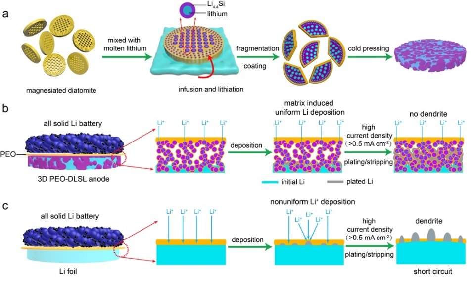 研究人員首先通過鎂熱還原法將天然的硅藻土轉(zhuǎn)化為具有多級(jí)孔道結(jié)構(gòu)的硅框架。隨后,將該多級(jí)結(jié)構(gòu)硅框架與熔融態(tài)的鋰金屬混合并充分?jǐn)嚢璺磻?yīng)制得鋰-硅復(fù)合粉體。然后,采用聚環(huán)氧乙烷基聚合物固態(tài)電解質(zhì)(PEO-SPE)對(duì)鋰-硅粉體進(jìn)行表面修飾。最后,通過冷壓工藝將上述粉體在模具中壓制成具有多級(jí)結(jié)構(gòu)的復(fù)合鋰金屬負(fù)極(PEO-DLSL)(圖1a)。在PEO-DLSL中,鋰金屬是嵌在PEO-SPE修飾的Li4.4Si框架的孔道結(jié)構(gòu)之中,從而提升了其與電解質(zhì)的接觸面積,有利于得到更均勻的鋰離子流,保持了電極結(jié)構(gòu)的完整性。從而使得在較高電流密度下(>0.5 mA cm-2),多級(jí)結(jié)構(gòu)鋰金屬?gòu)?fù)合負(fù)極能夠?qū)崿F(xiàn)鋰金屬的均勻沉積和脫出,有效抑制了鋰枝晶的生長(zhǎng)(圖1b)。而對(duì)于傳統(tǒng)的平板鋰箔而言,在同樣的條件下,鋰枝晶很容易生長(zhǎng)并引起電池短路(圖1c)。