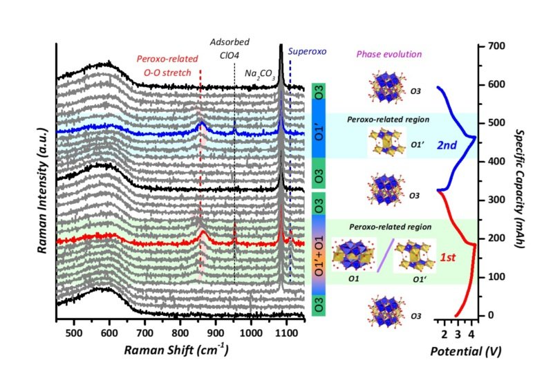在近期的研究中,研究人員在缺鈉(P2型為主)和富鈉(O3型為主)的層狀結構中均觀測到了陰離子的氧化還原反應。而針對層狀富鈉材料的研究一直以來進展較為緩慢。首先是現有的關于富鈉材料的研究,其電化學反應的核心均為釕和銥這類5d元素的貴金屬,這在一定程度上提升了鈉離子電池的生產成本。其次,在報道的層狀富鈉材料中往往存在一定的O2釋放,不利于電極材料的穩定循環。